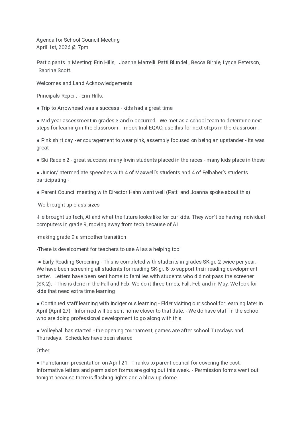 ● Parent Council meeting with Director Hahn went well (Patti and Joanna spoke about this)